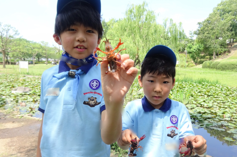 活動再開後、2回目の活動は柏谷公園でザリガニ釣りです。