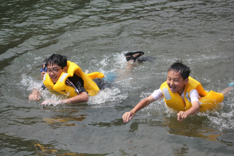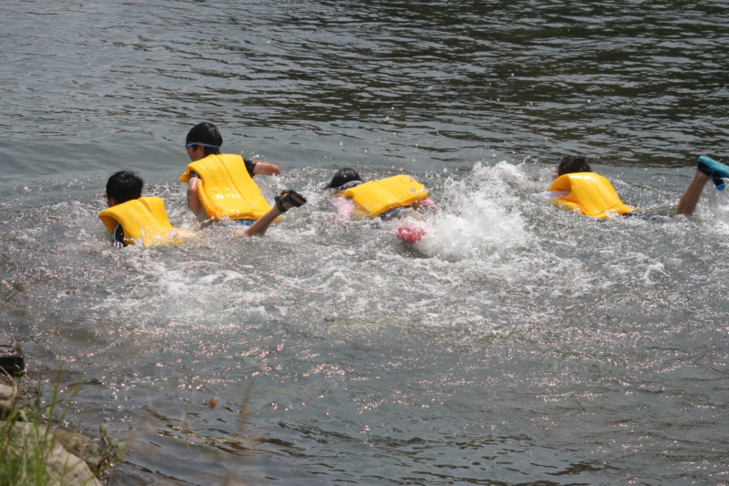 まずは、救命胴衣を着用しての泳ぎ方の練習。