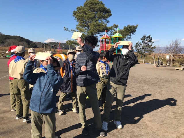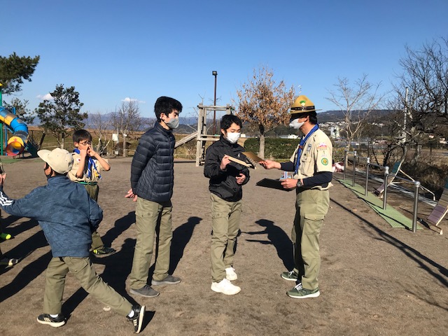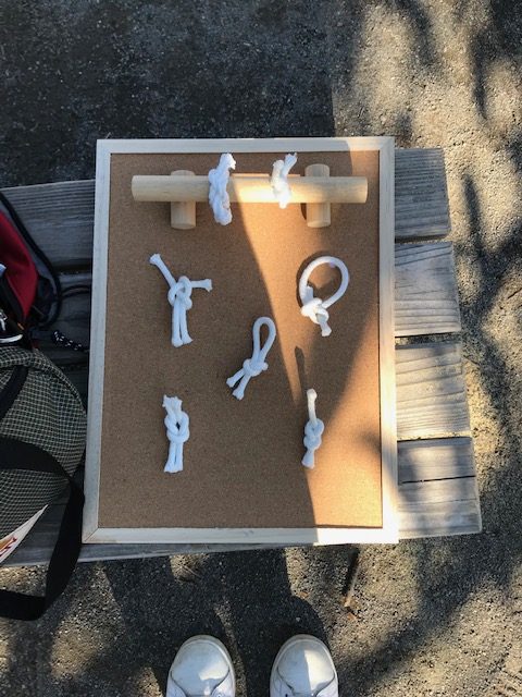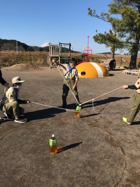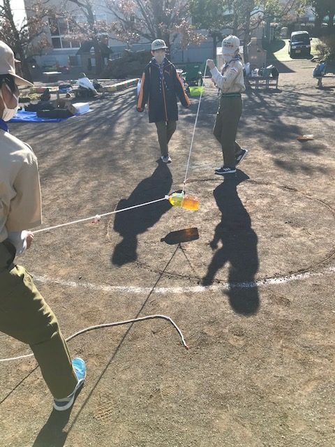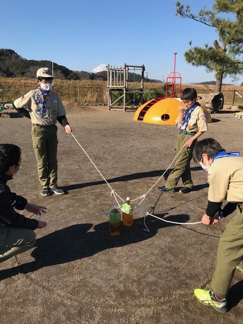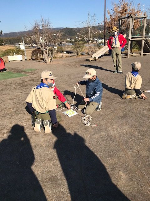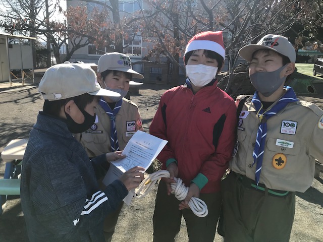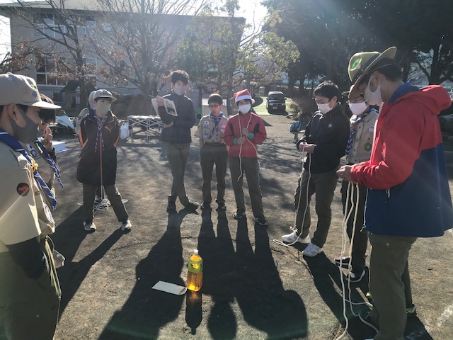 今回の班集会は日ごろ練習しているロープワークでノッティングボード作りをしました。