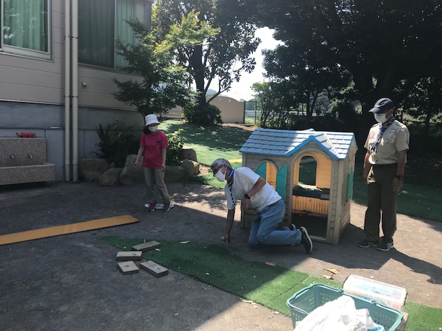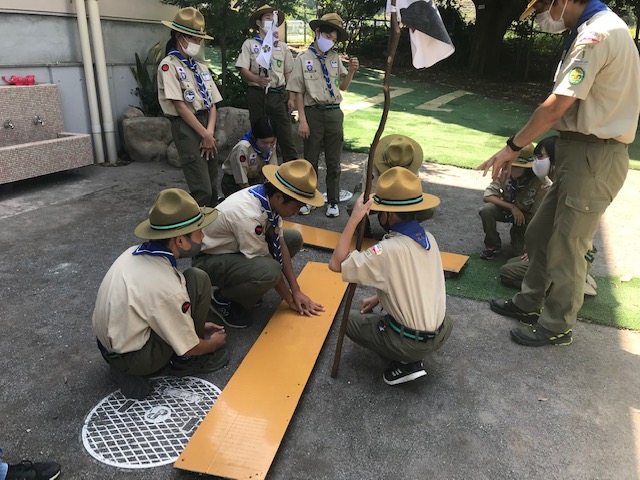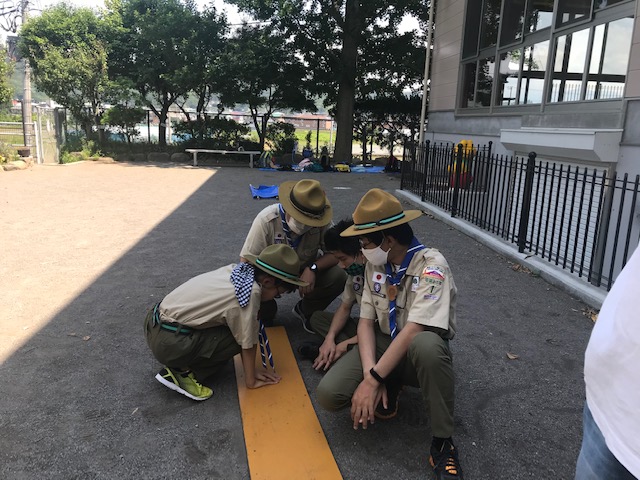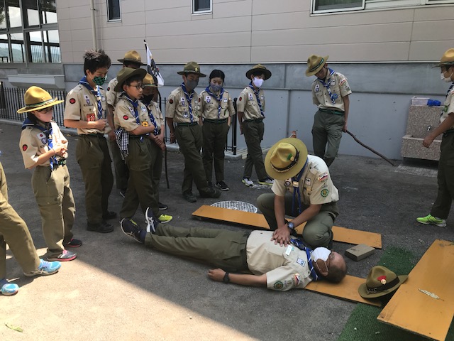 スカウト達は板を人に見立てて心臓マッサージの練習です。