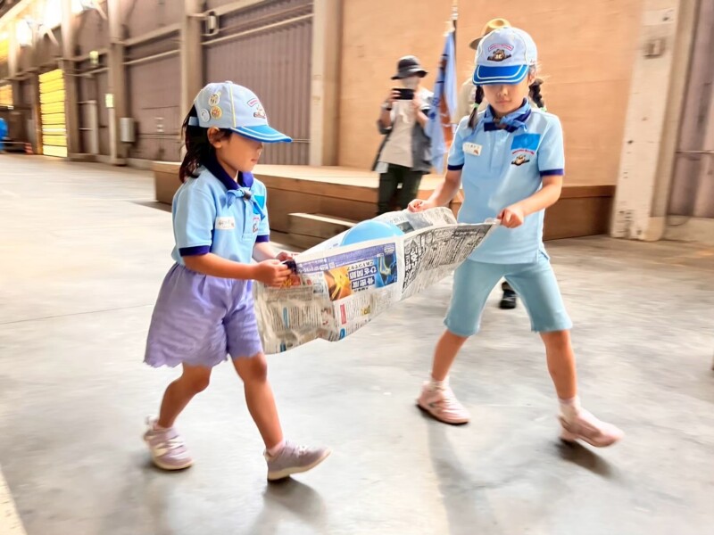 ジャンケン列車で緊張をほぐし、風船運びや水入れ競争、新聞紙パンチのパン食い競争など盛りだくさん。