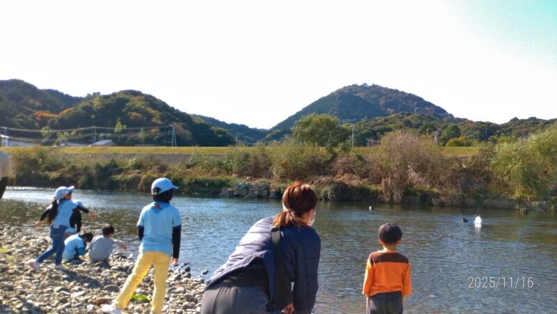 河原で「石投げ大会」が始まり、「あそこまで届くかな〜!」と大盛り上がり!