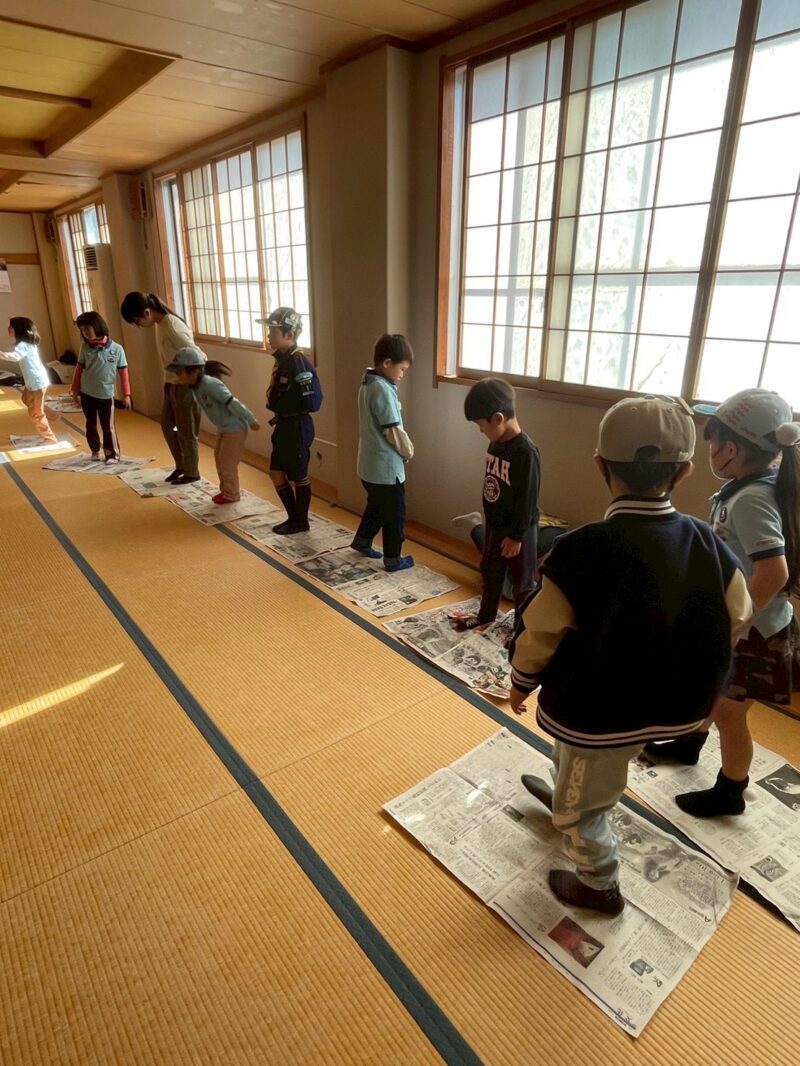 準備が整うまでの時間は、新聞紙ゲームで大盛り上がり。