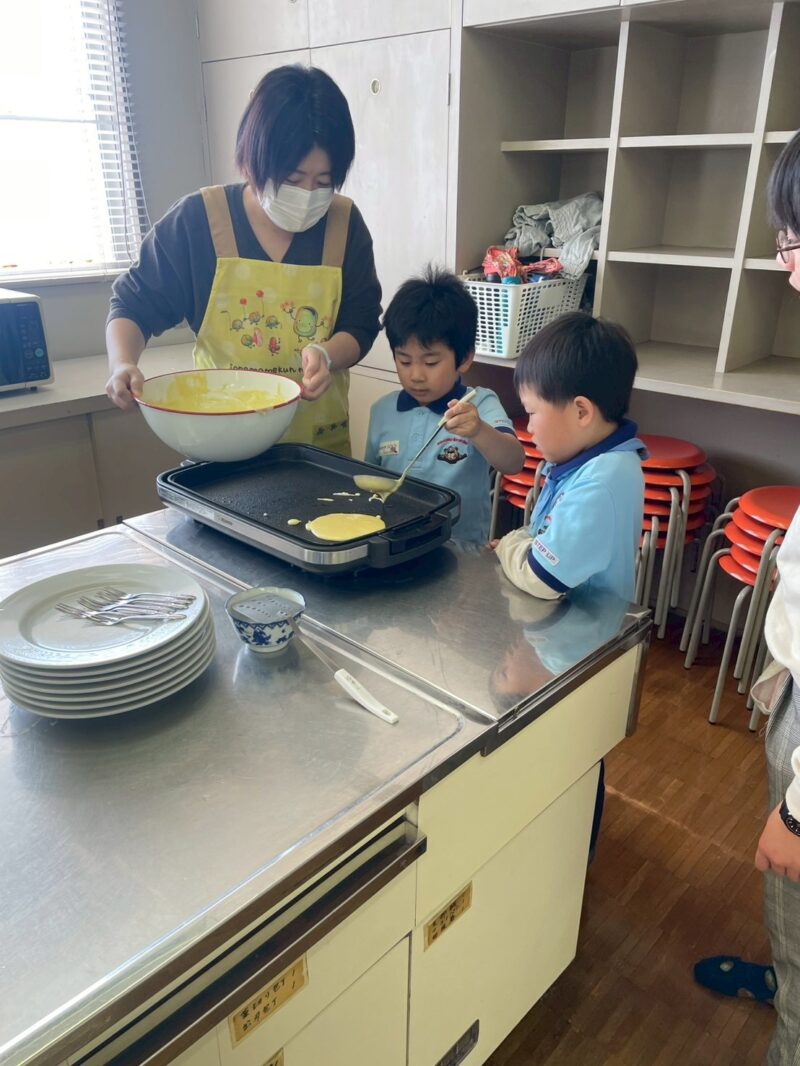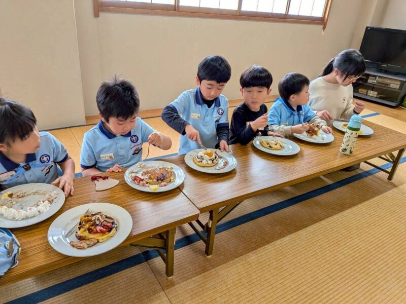 みんなでホットケーキを作って、トッピングを楽しみながら食べる活動を行いました。