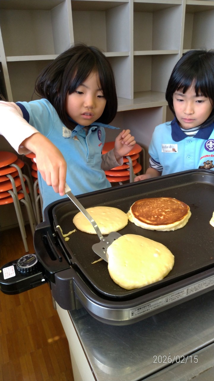 完成したホットケーキを嬉しそうに見せ合う姿が印象的でした。