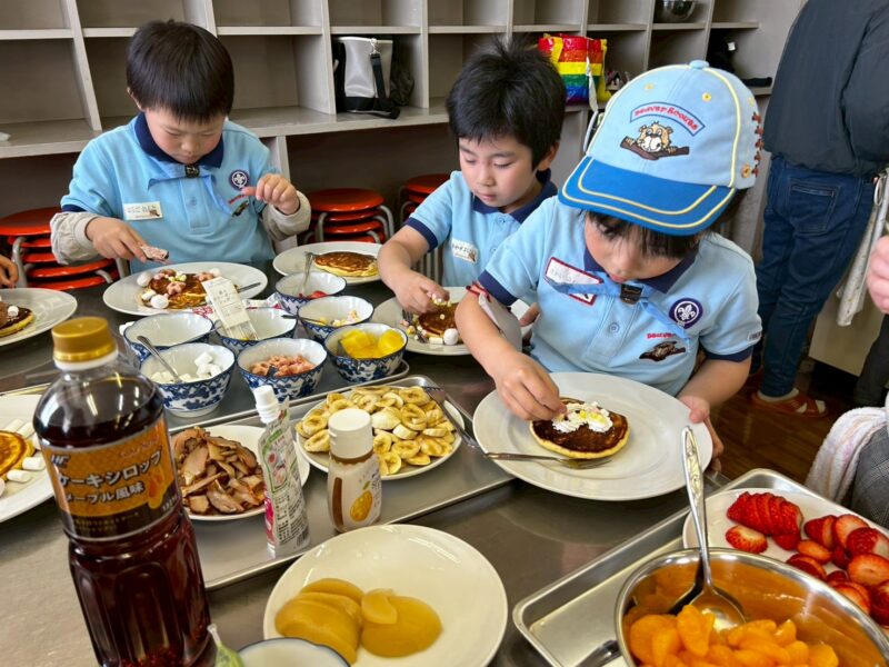 ホットケーキ作りの下準備では、多くの保護者の皆さまにご協力いただき、