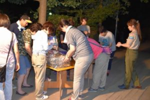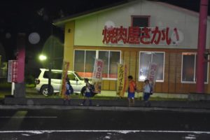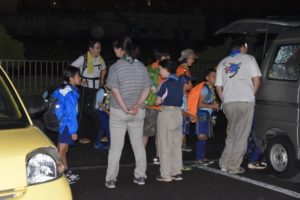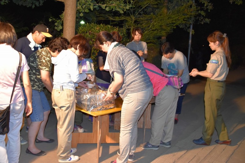 団委員と保護者は休憩地点の三島大社で振舞う夜食の準備です。