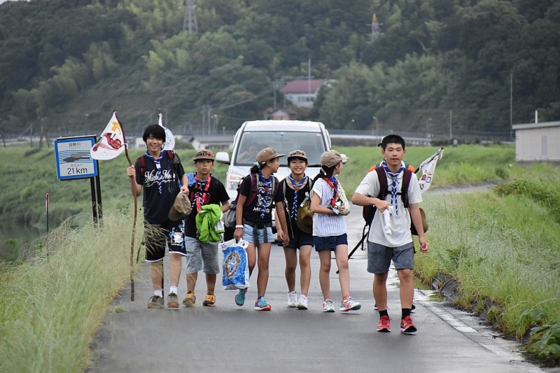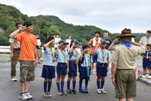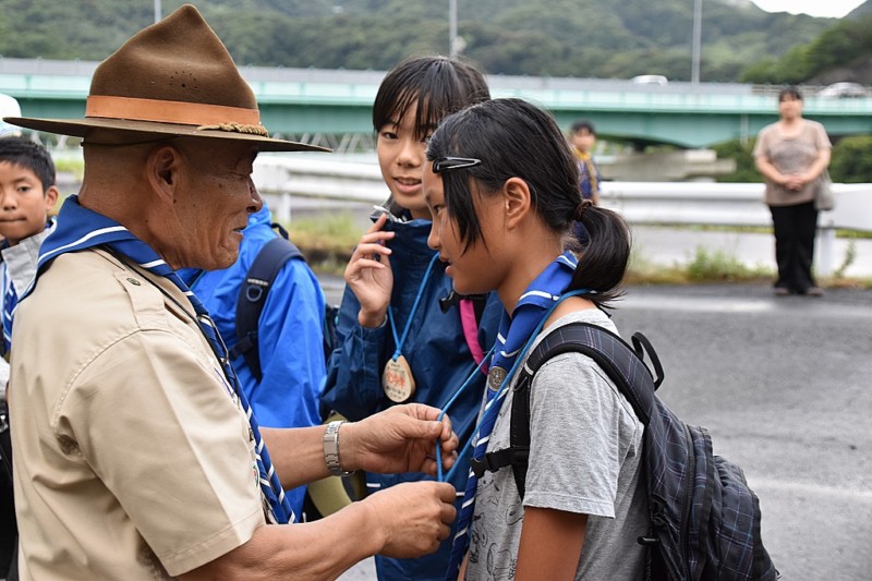 ゴールしたスカウトには団委員長から完歩章が送られました。