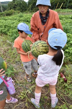 なす・ピーマン・スイカを収穫しました。