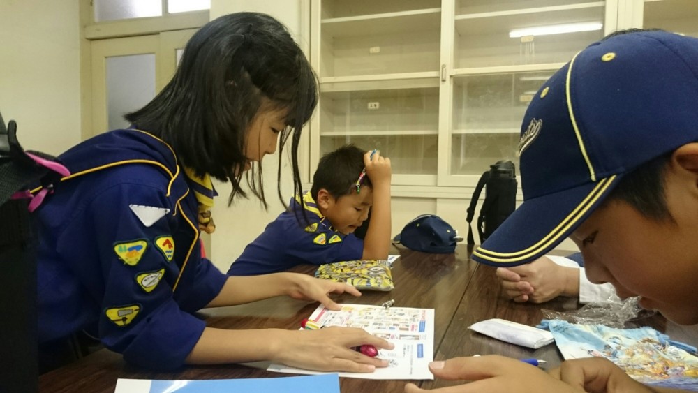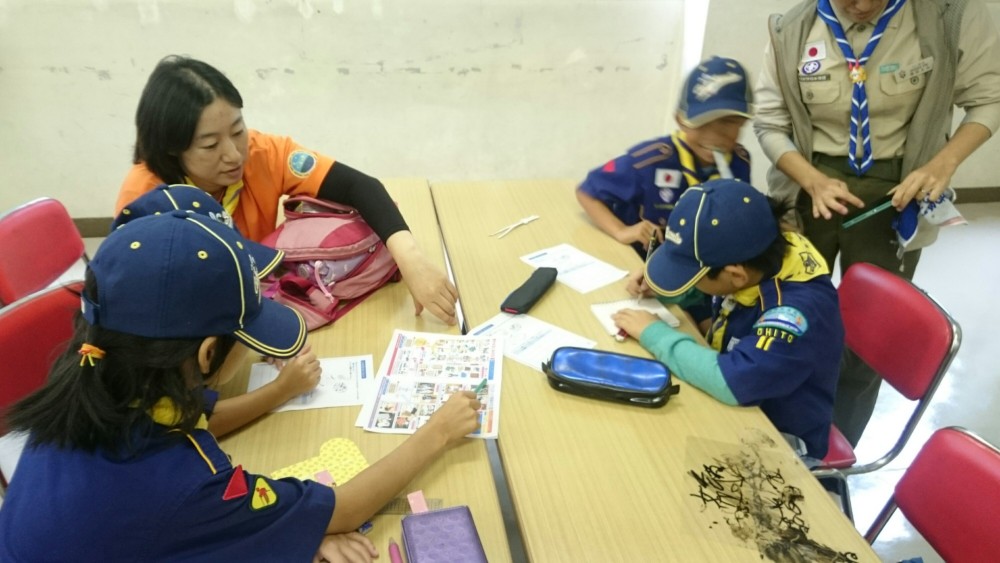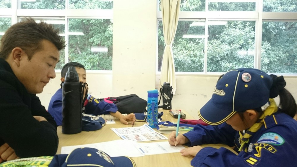 スカウト達は自分たちの 七つ道具カードを丁寧に作っていました。