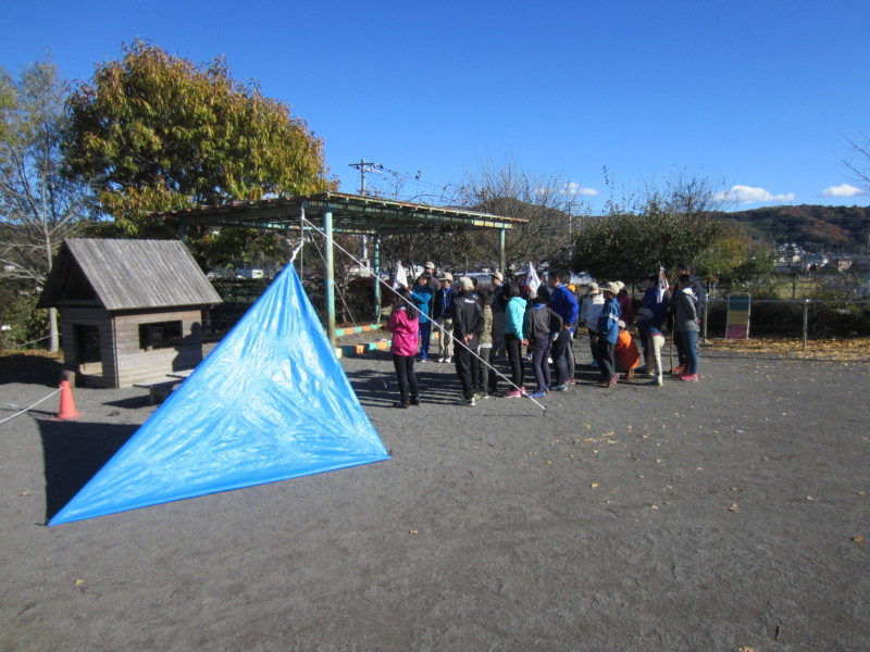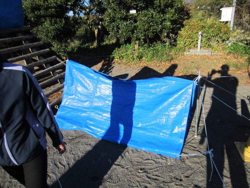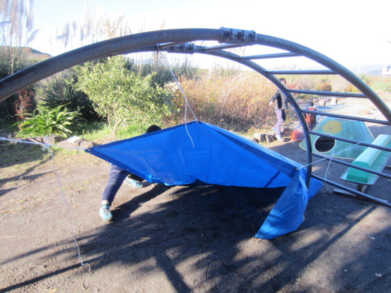今回は、『ブルーシート1枚・ポール1本、ペグ3本』で設営します。
