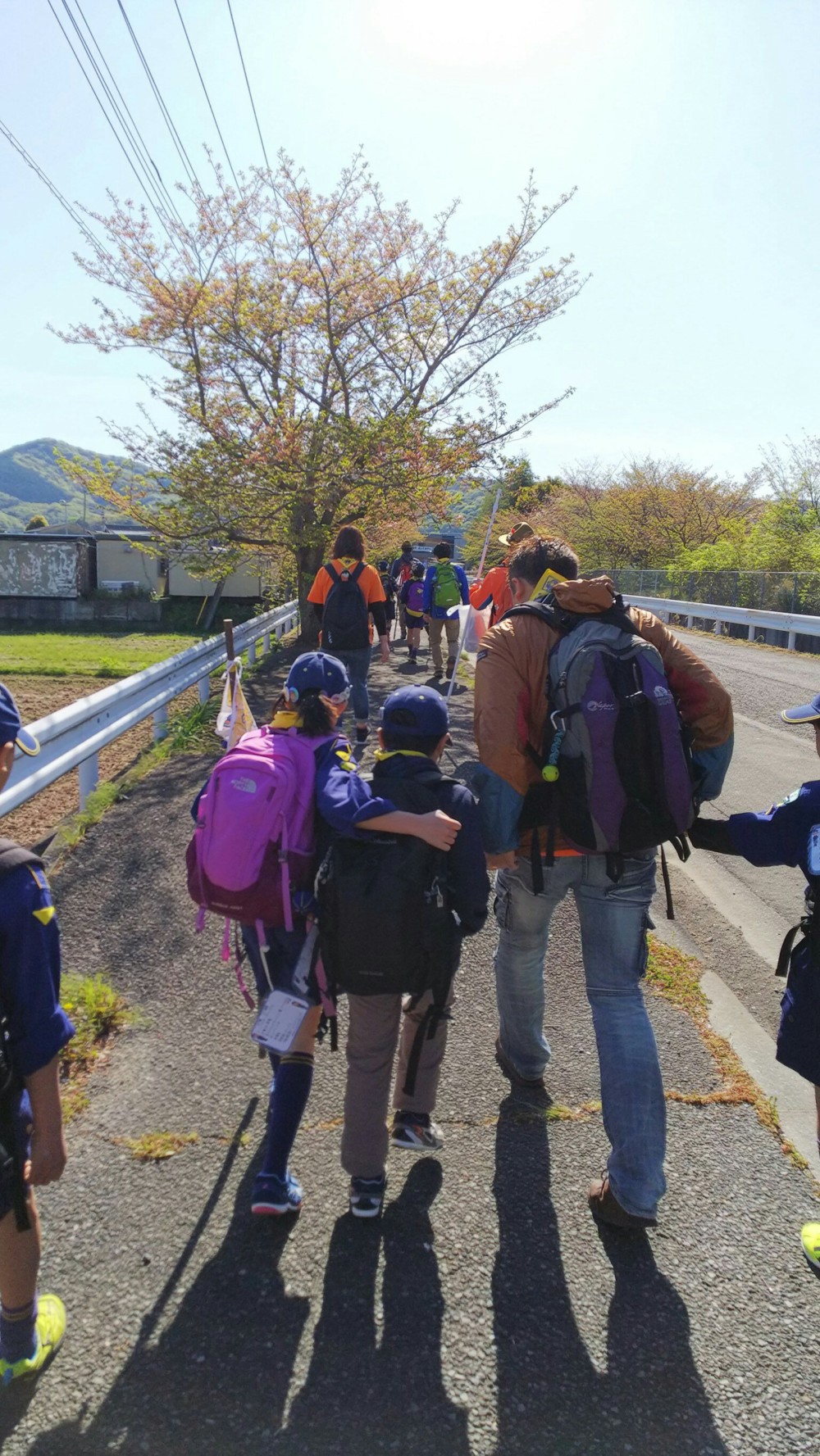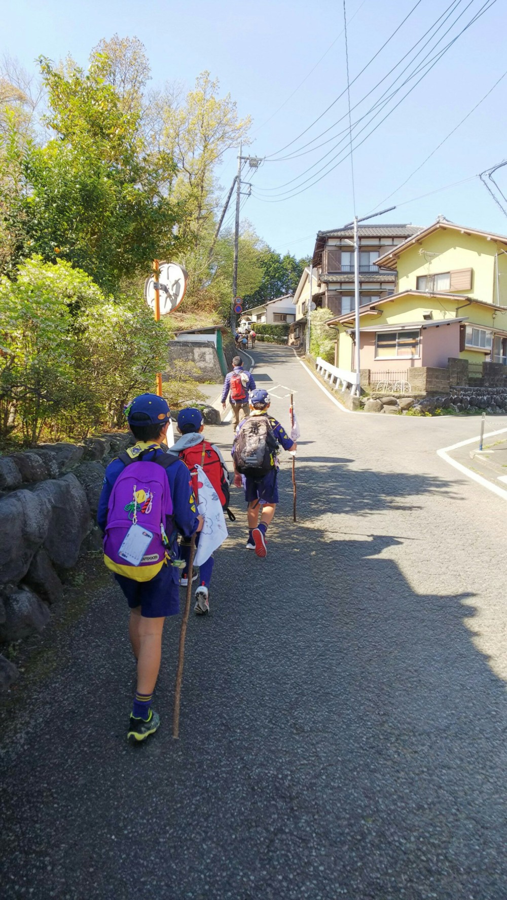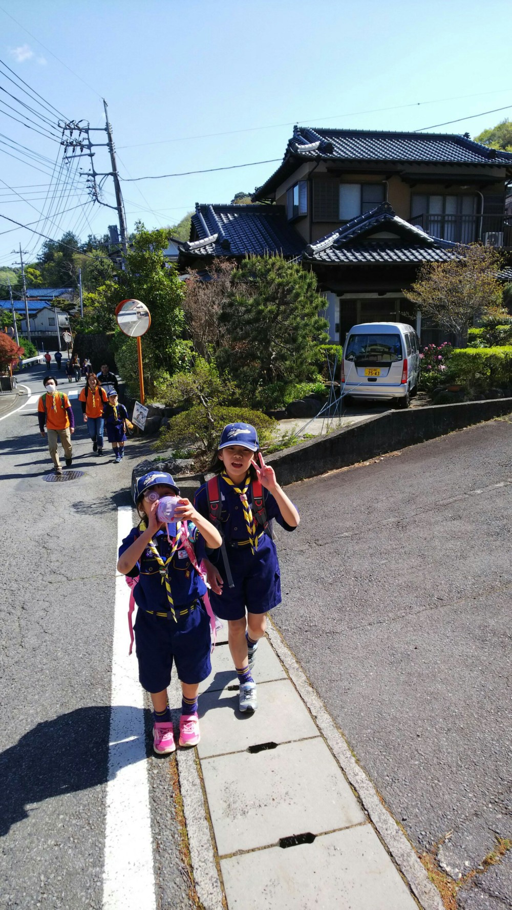 くまスカウトが励ましながら大仁中学校へ向かって行きます。