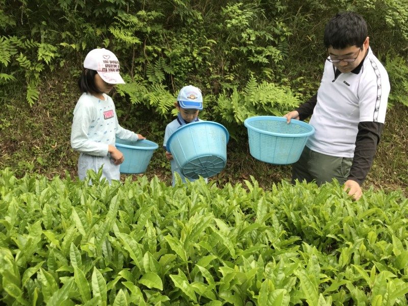 お父さん、お母さん、兄姉も応援参加。さっそく茶摘み開始です。