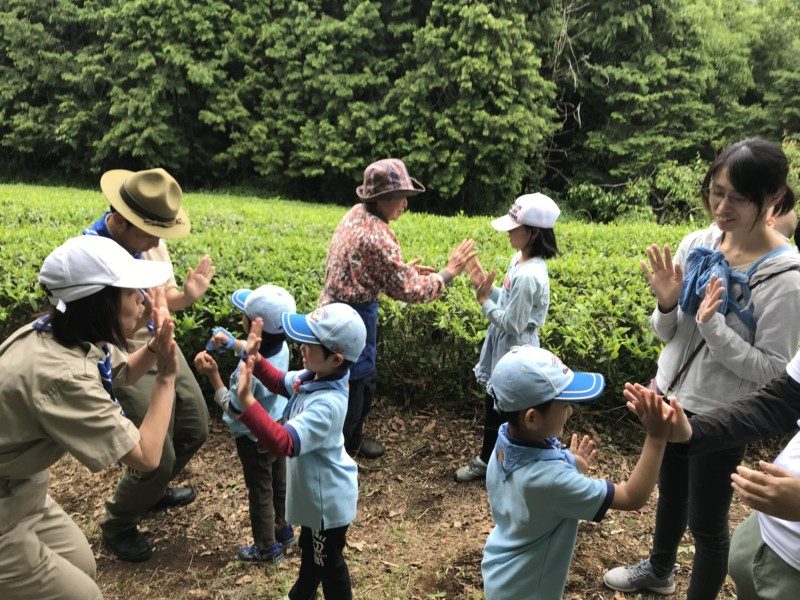 続いてゲーム、目隠しをして茶畑を歩いてみました。お茶のにおいと、小鳥のさえずりのなか、
