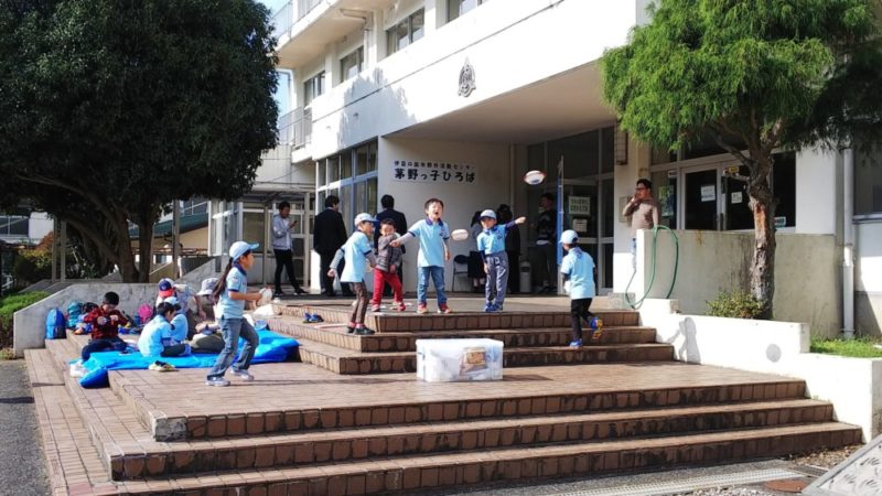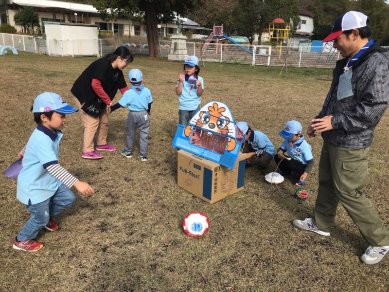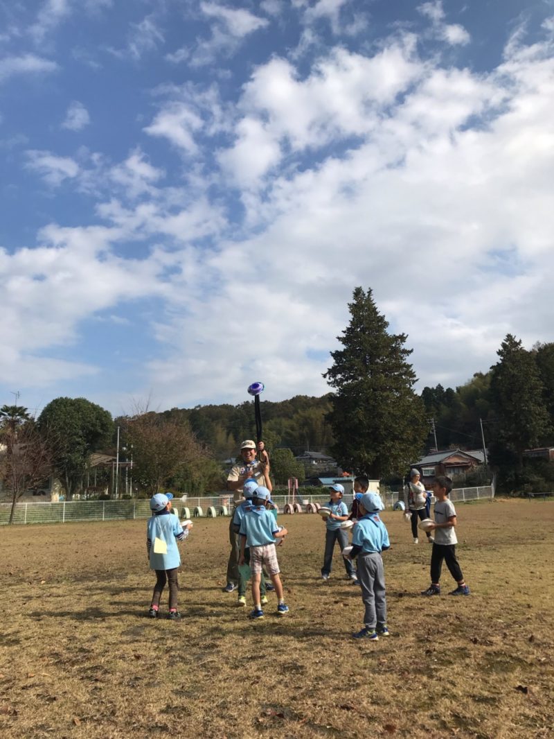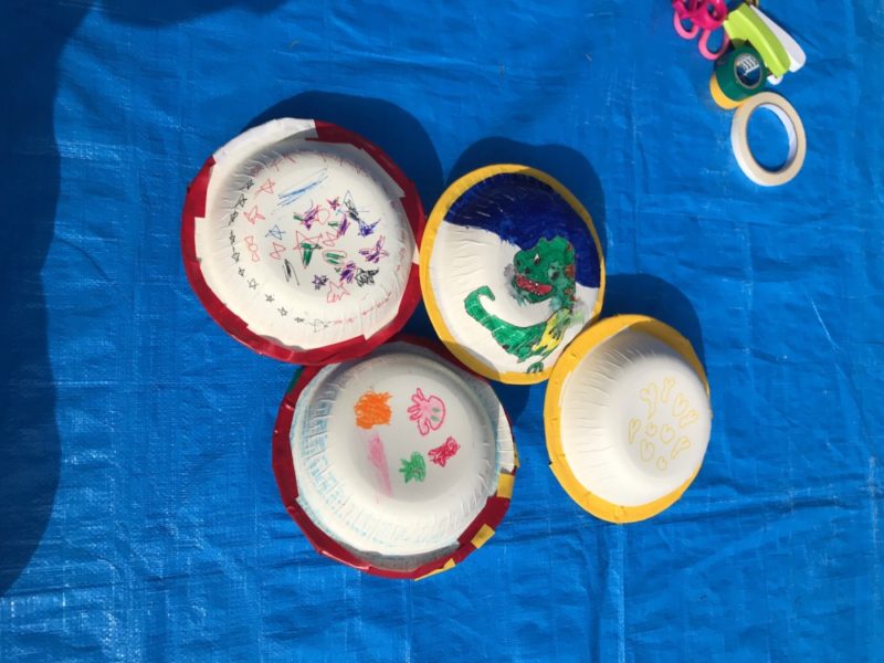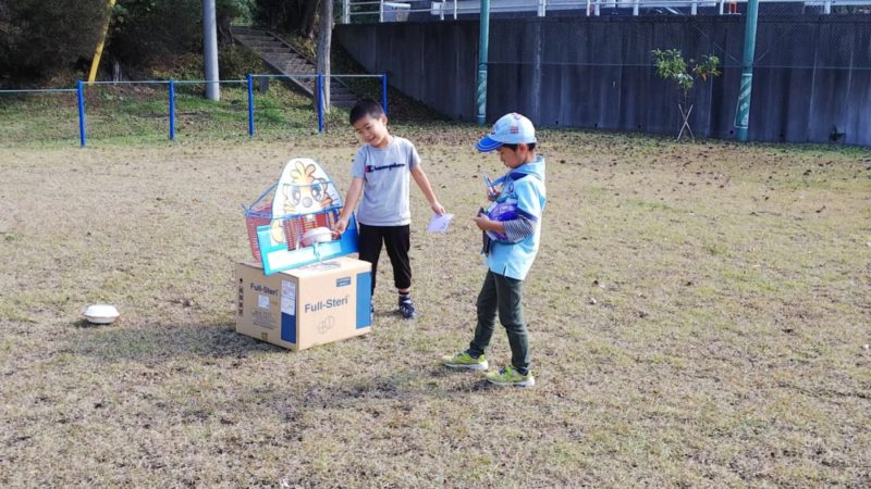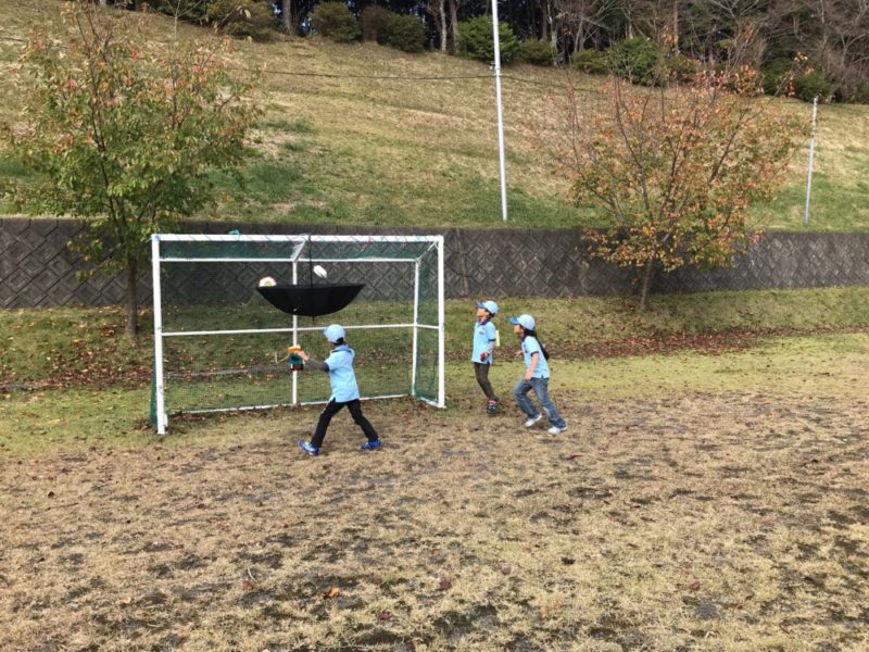 円盤を手作りして、その円盤をゴールにいかに少ない投数でいれられるかを行います。