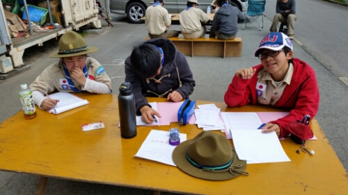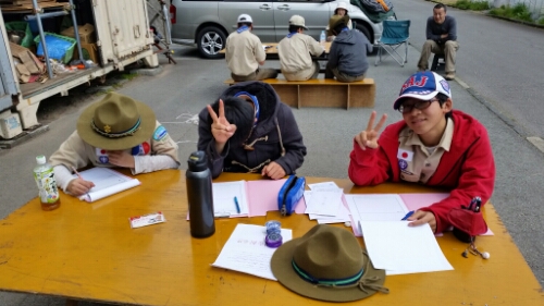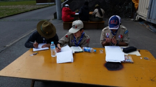 2日目、スカウトたちの大きな弥栄で起こされた隊長たち。
